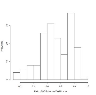 Here is a histogram of the ODF/OOXML size ratios for the sampled files. As you can see, there is a wide range of behaviors here, with some files even ending up larger in ODF format. But on average the ODF files were smaller.