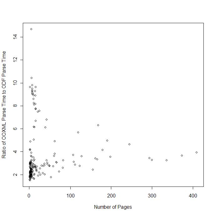 The results indicate that the ODF documents were parsed, on average 3.6x faster than the equivalent OOXML files. Here is a plot showing the ratio of OOXML parse time to ODF parse time as a function of page size:As you can see there is a wide variation in this ratio, especially with shorter documents. In some case the OOXML document took 8x or more longer time to parse than the equivelant ODF document. But with longer documents the variation settles out and settles on the 3.6x factor mentioned