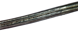 This is an electrical cord for the lamp. The codes indicate that this is a SPT-2 , #18 gauge flexible cord. SPT (Service Parallel Thermoplastic) is a standard defined by the American Society for Testing and Materials (ASTM) and approved by Underwriters Laboratories (UL). The gauge is measured in American Wire Gauge (AWG) units, also known as the Brown & Sharpe gauge, a standard dating back to 1855.
