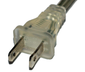 From the lamp we have the male end, an AC power plug. On my lamp the connector is a polarized, ungrounding NEMA 1-15P plug.