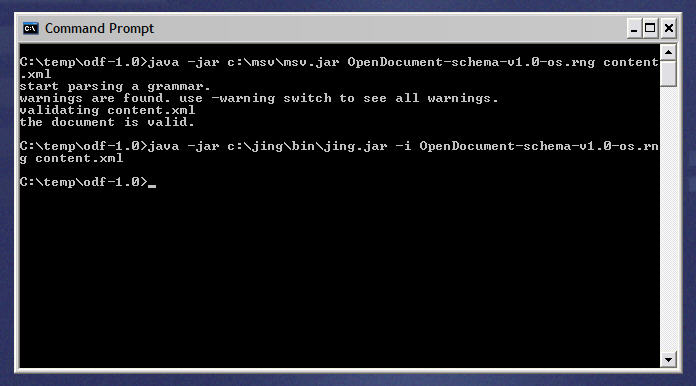 Unadulterated copy of James Clark’s Relax NG validator jing. Unadulterated copy of Kohsuke Kawaguchi’s Sun Multi-Schema Validator msv. Unadulterated copy of the ODF 1.0 Relax NG schema. Unadulterated copy of the ODF 1.0 Standard, in ODF format.